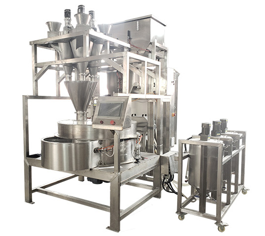 PLC自動(dòng)化控制,原料、粉劑、料液自動(dòng)補(bǔ)充,裹衣過(guò)程根據(jù)工藝改變添加參數(shù)及節(jié)奏,亦可根據(jù)粉劑種類的不同添加多個(gè)料筒,滿足了各類產(chǎn)品的工藝要求。密閉式結(jié)構(gòu),改善了傳統(tǒng)加工過(guò)程粉塵污染問(wèn)題。一鍵式智能操作高度自動(dòng)化,大大的減少了勞動(dòng)強(qiáng)度和對(duì)工人裹衣技術(shù)的依賴;使裹衣質(zhì)量、均勻度不在受人為因素影響;實(shí)現(xiàn)了一人多機(jī),高產(chǎn)量高質(zhì)量的自動(dòng)化生產(chǎn)。